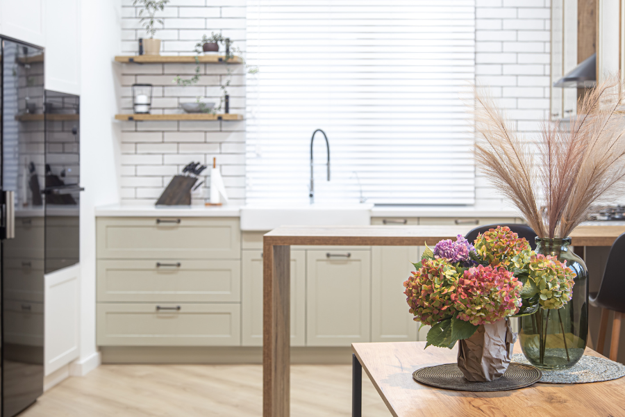 Lighter wood tones like blonde oak or soft gray add brightness and complement white or pastel kitchens.